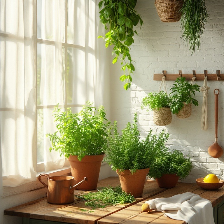 Ervas frescas como manjericão, hortelã e alecrim trazem aroma, frescor e funcionalidade. Um mini jardim de ervas pode ser montado perto da janela ou em suportes suspensos.